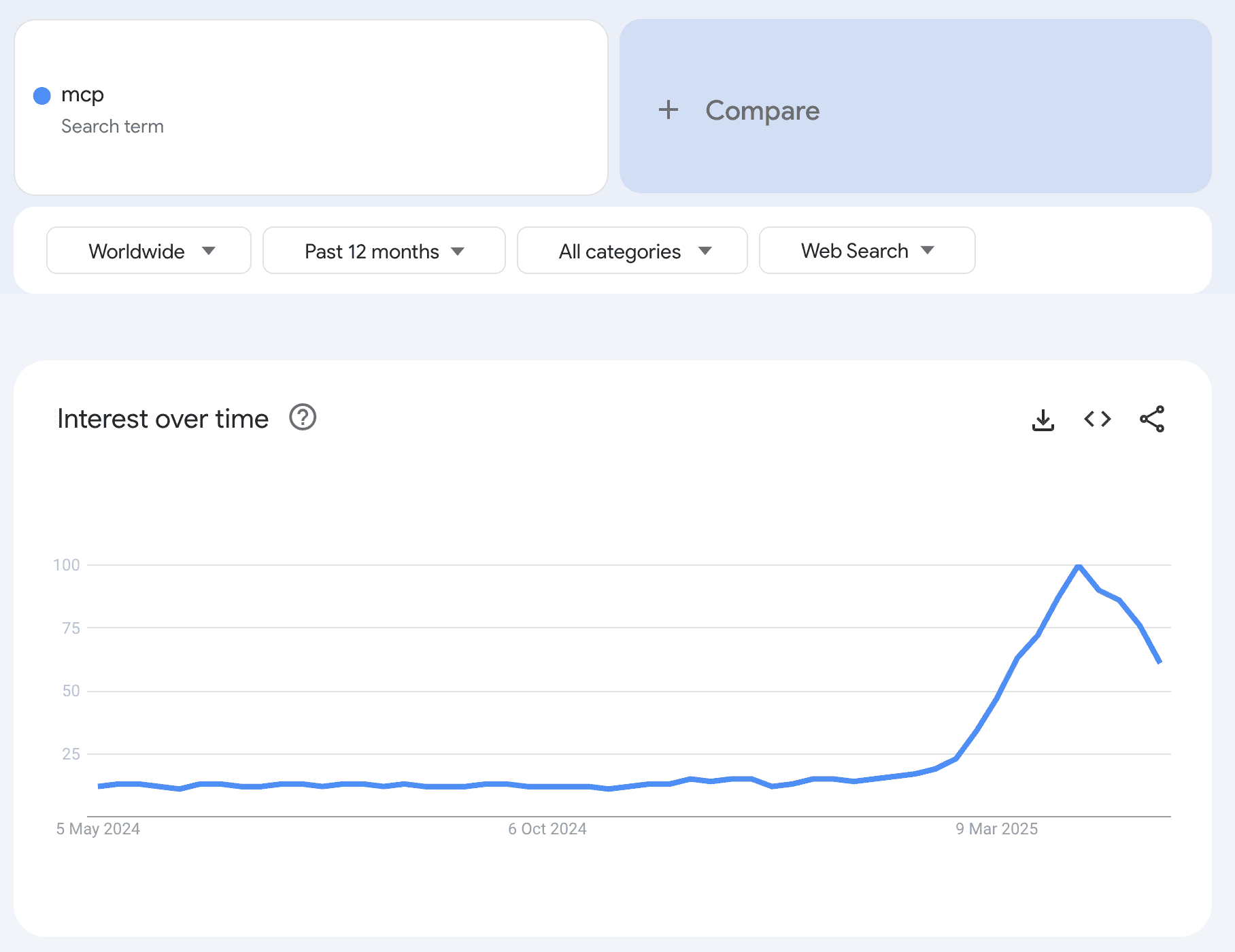 Anthropicは、この標準で明らかに共感を呼びました。当時X(旧Twitter)にいた方なら、1日に複数のMCP関連の投稿を目にしたことでしょう。「MCP」のGoogleトレンドも同じことを示しています