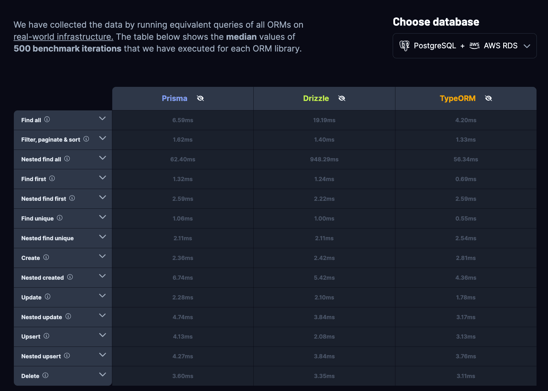 - TypeORM と Drizzle ORM は API がより制限されており、一部の Prisma ORM クエリ(ネストされた作成など)は、それらの上位レベルの抽象化では表現できません。これらの場合、私たちはそれらの SQL クエリビルダーを使用するようにしています。