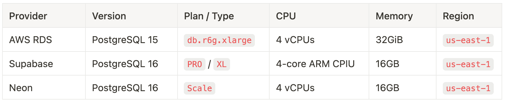 おそらくRDSは、ベンチマークスクリプトが同じセキュリティグループ内のEC2インスタンスから実行されたのに対し、SupabaseとNeonのDBはパブリックインターネット経由でアクセス可能であるため、有利であったと思われます。