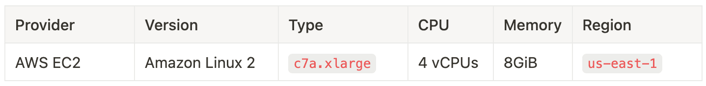 データを収集するために、実際の使用シナリオをシミュレートするため、本番環境のインフラストラクチャでベンチマークを実行しました。スクリプトは、以下のスペックのEC2インスタンスから実行されました。