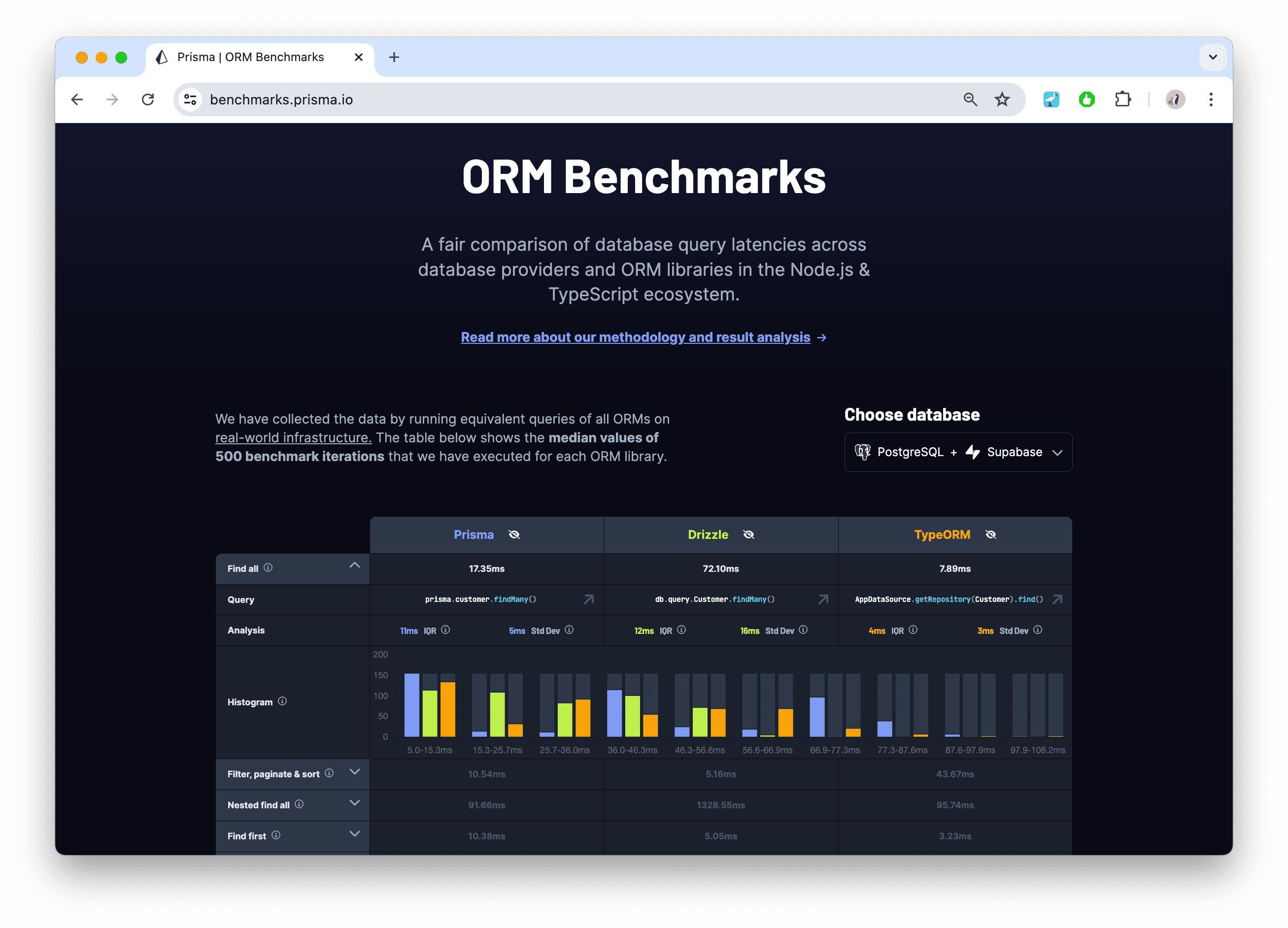 当社のベンチマーク実行結果は、https://benchmarks.prisma.io でご覧いただけます。ぜひご覧になり、X や Discord でご意見をお聞かせください。このベンチマークを皆様にとってさらに役立つものにする方法について、特に皆様のご意見を伺いたいと思っており、改善のご提案も歓迎いたします!