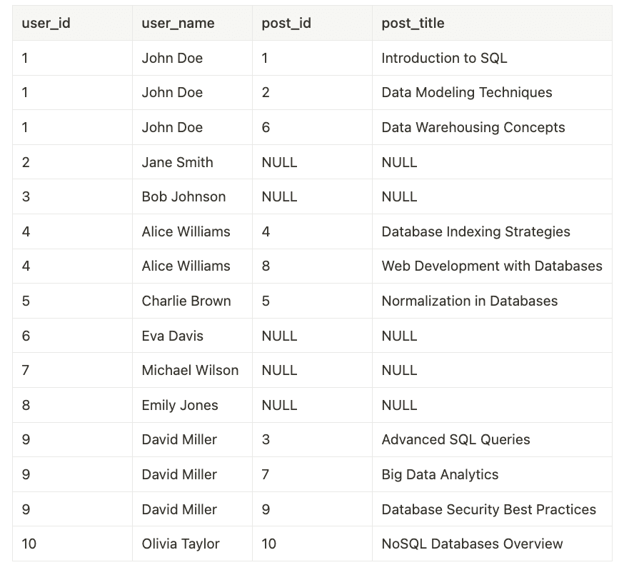 全てのユーザーとその投稿を取得するには、シンプルなLEFT JOINクエリを使用できます。