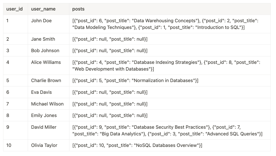 ここに、json_aggとjson_build_objectを使用して冗長性の問題を解決し、ユーザーごとの投稿をJSON形式で返すPostgreSQLの例を示します。