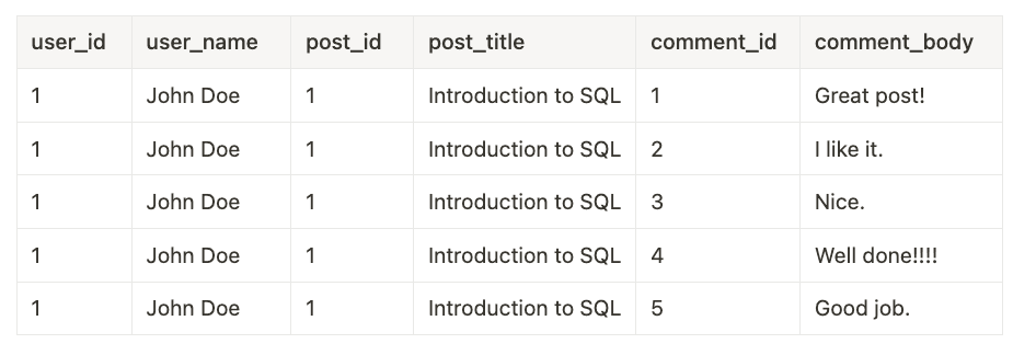 この場合、user_nameカラムに冗長性があることに注目してください。結合されるテーブルが増えるほど、この冗長性はさらに悪化します。たとえば、各コメントがPostテーブルのレコードを指すpostId外部キーを持つ別のCommentテーブルがあると仮定します。