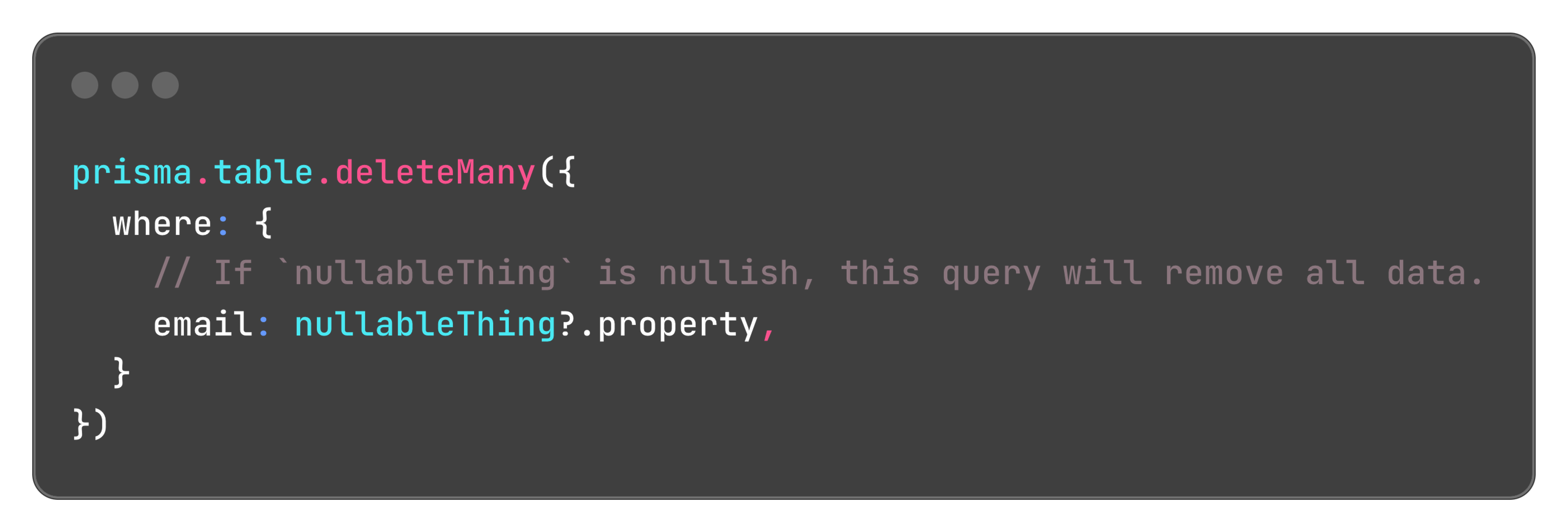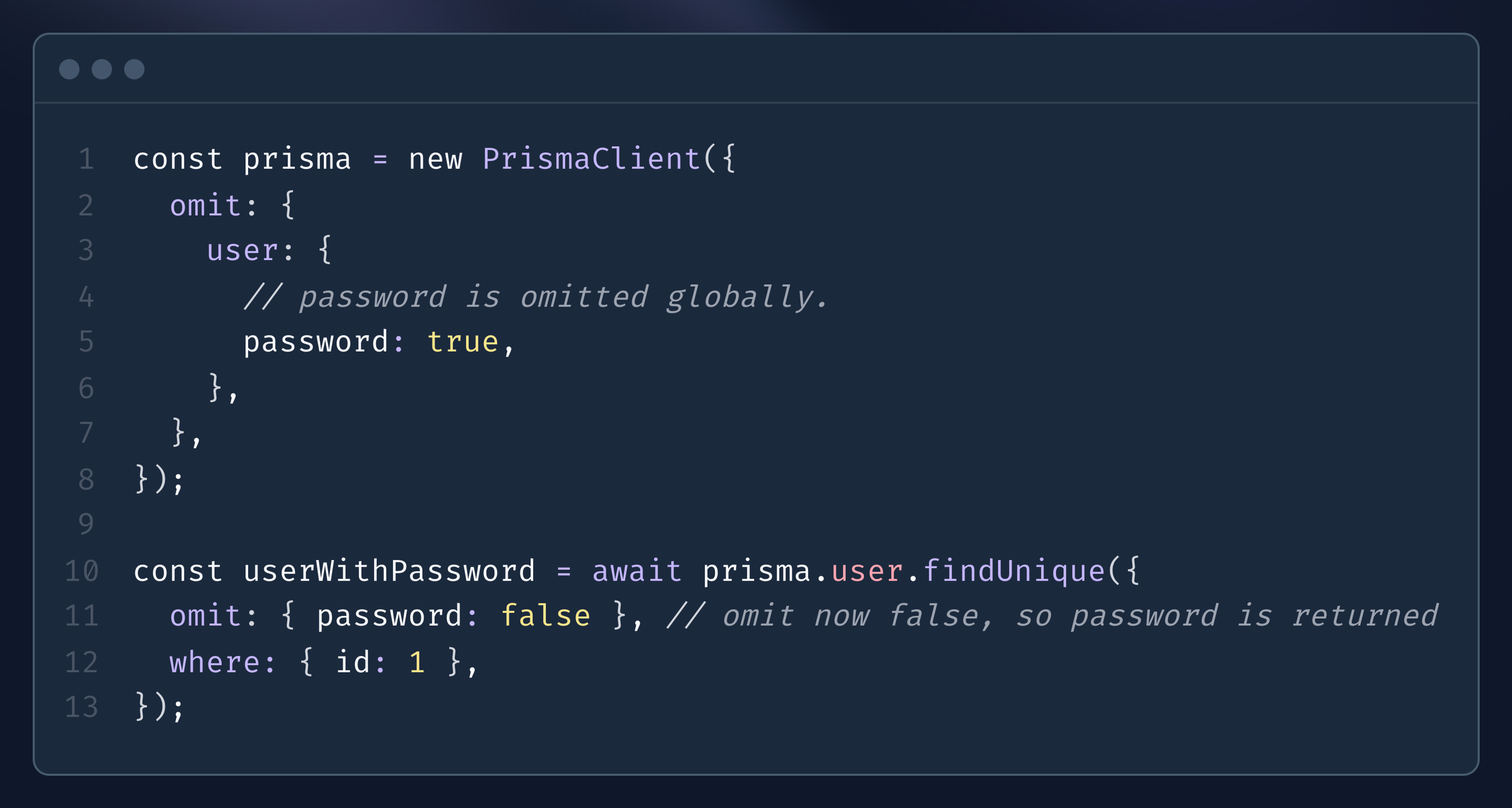 5.13.0で、Prisma Clientのクエリオプション内にomitオプションのプレビューサポートを導入しました。今回、omitApiプレビュー機能を拡張し、グローバルにフィールドを省略する機能も含むことを発表できることを大変嬉しく思います。