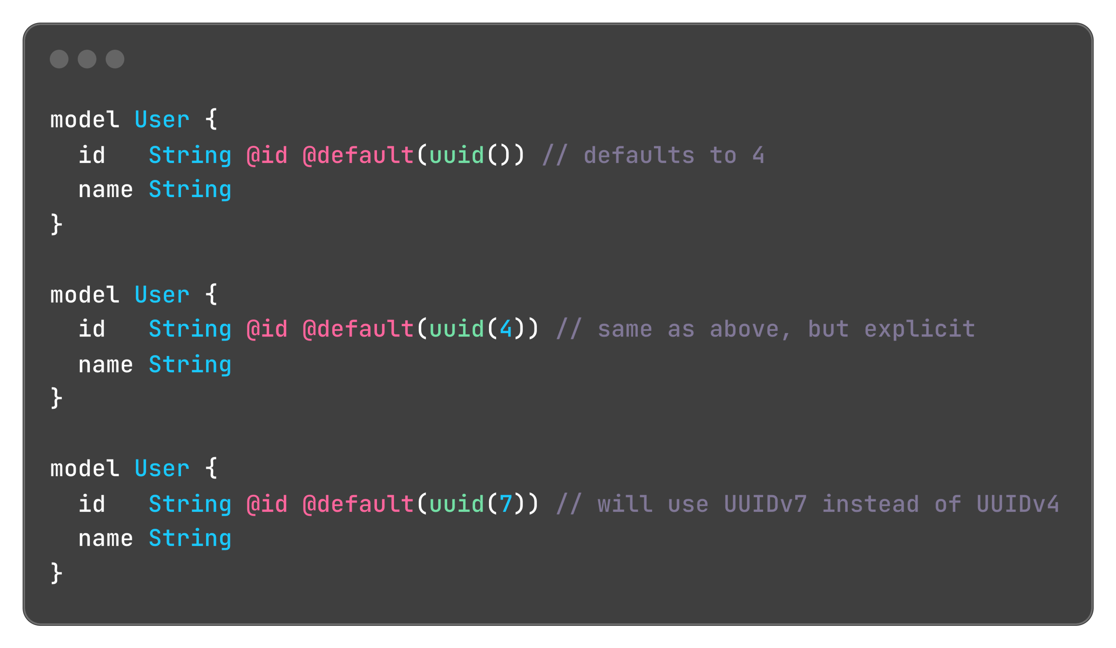 1// Single-column shard key2model User {3 id String @default(uuid())4 region String @shardKey5}67// Multi-column shard key8model User {9 id String @default(uuid())10 country String11 customerId String12 @@shardKey([country, customerId])13}