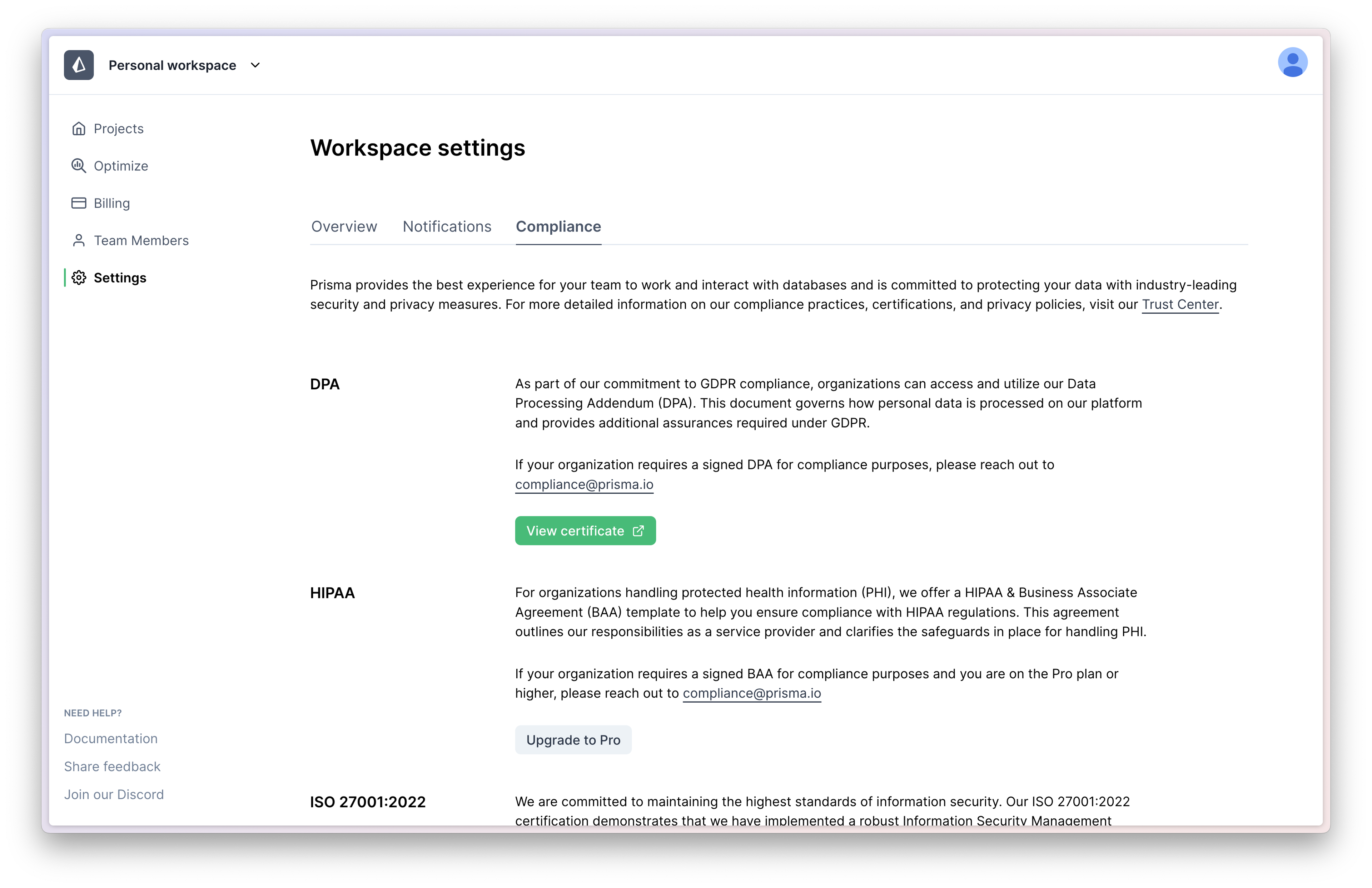 Prismaは、SOC2 Type II、HIPAA、GDPR、ISO 27001:2022認証に必要なプロセスとコントロールを正常に実装しました。これらの成果は、データベースを扱う開発者向けに安全で信頼性の高いソフトウェアソリューションを提供するという当社のコミットメントを示すものです。