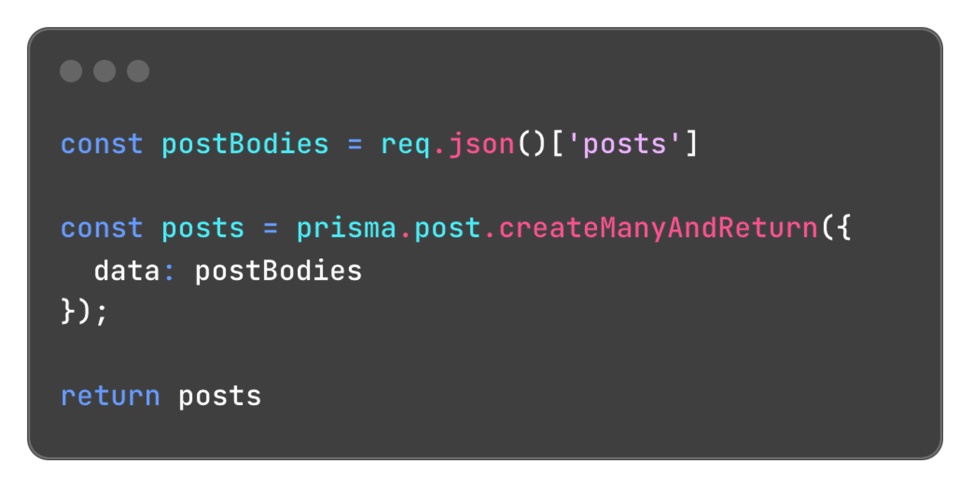 createManyAndReturn()5.14.0 リリースでは、新しいトップレベルの Prisma Client クエリ createManyAndReturn() を利用可能にしました。これは createMany() と同様に機能しますが、SQL クエリで RETURNING 句を使用して、作成されたばかりのレコードを取得します。