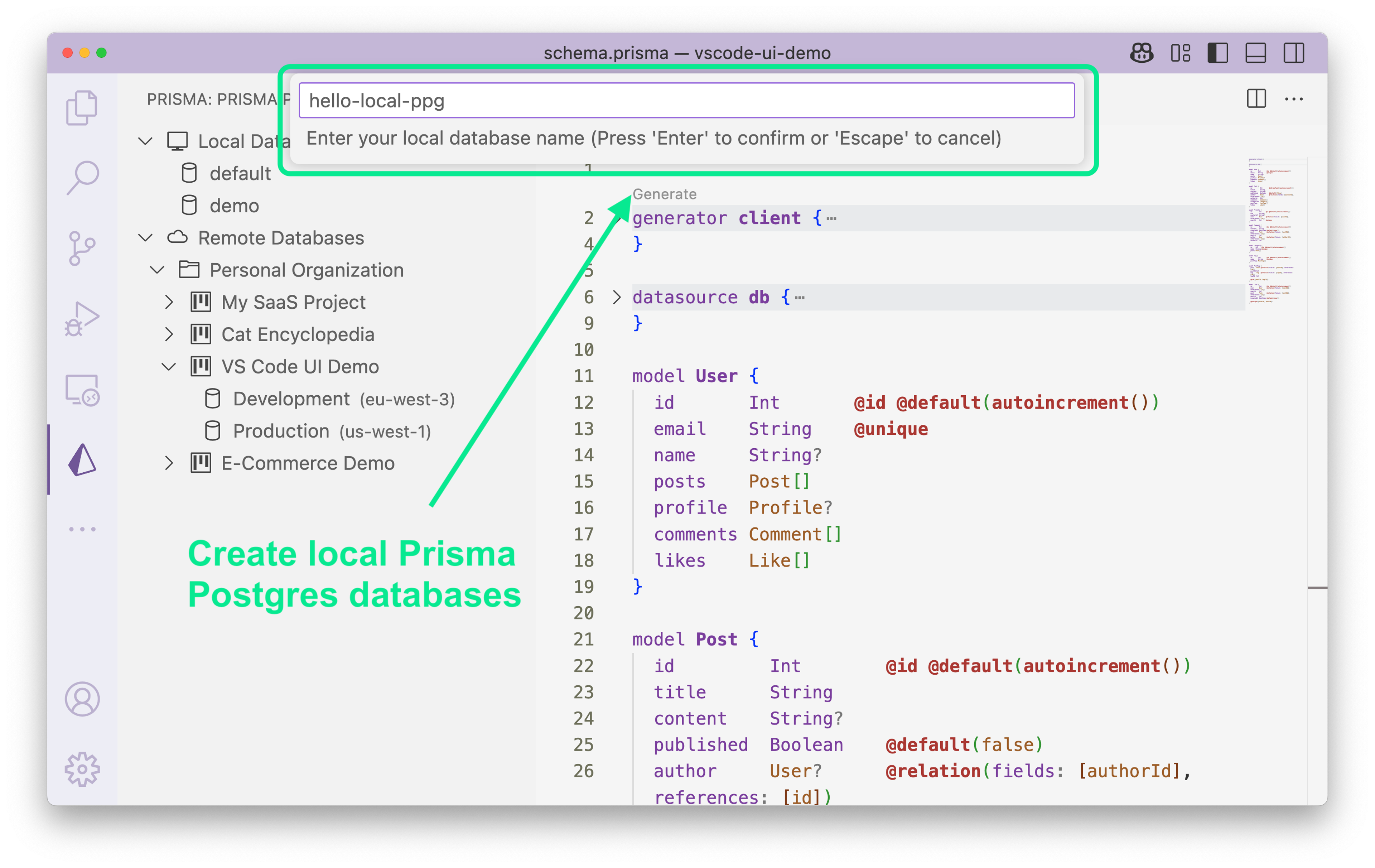 試すには、VS CodeのサイドバーでPrismaのロゴを見つけ、ローカルのPrisma Postgresインスタンスの管理を開始してください(Dockerは不要です)。