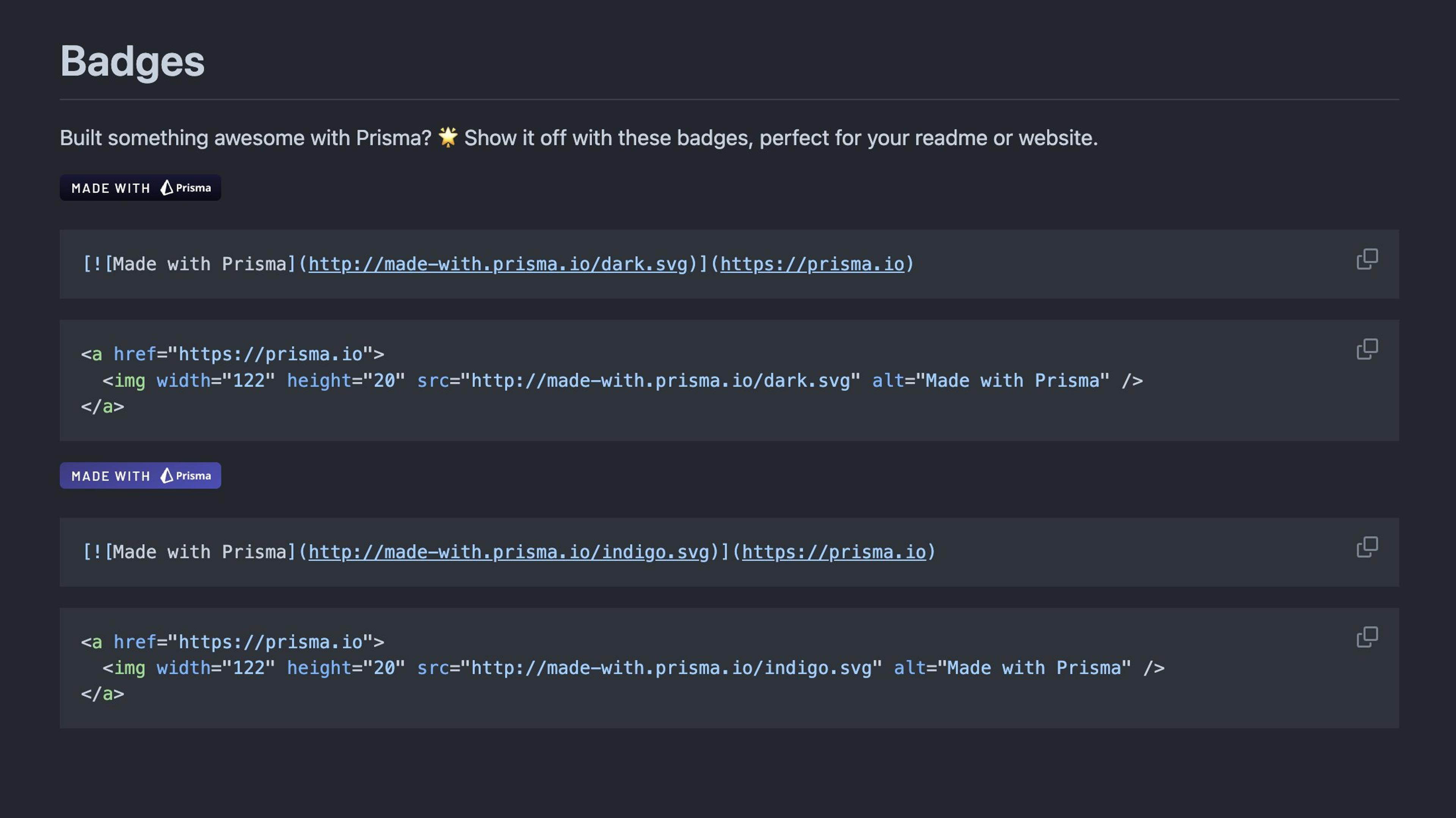 Prismaで素晴らしいものを構築しましたか?🌟 これらのバッジでそれを披露しましょう。READMEやウェブサイトに最適です。バッジの埋め込みについて詳しく学ぶ。