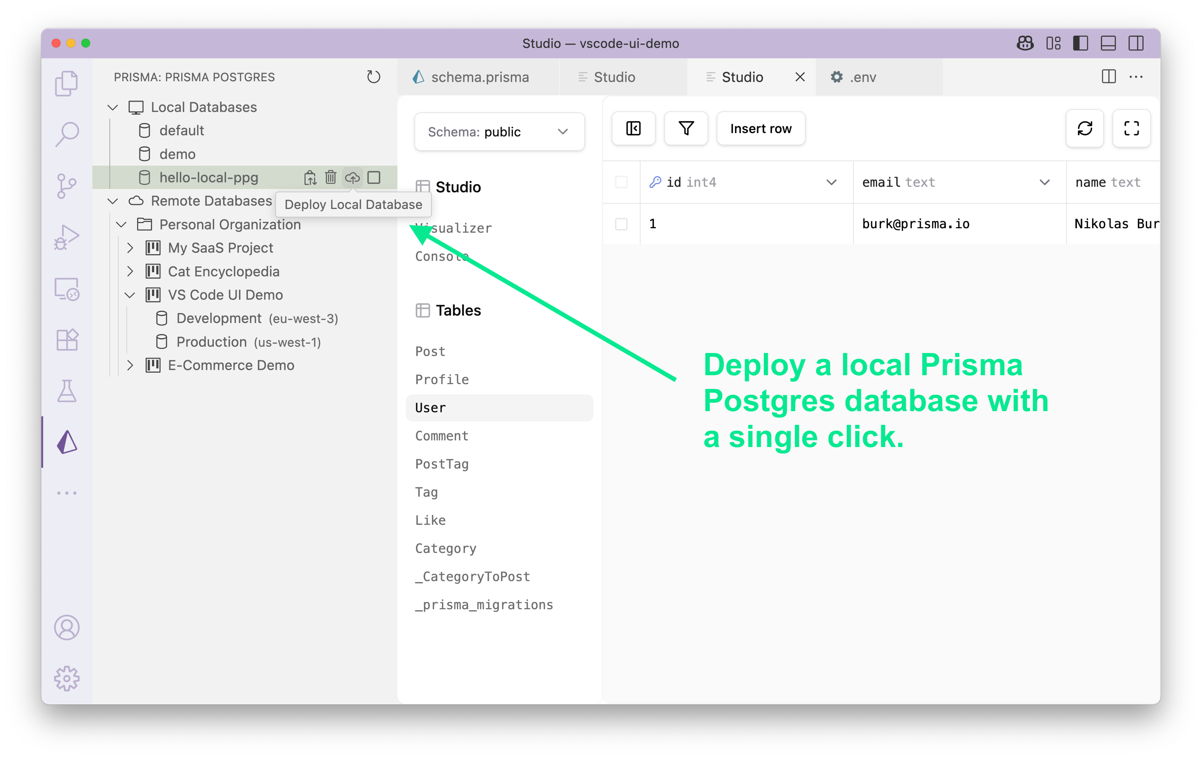 VS Codeのデータベース管理UIに、Push to Cloudボタンが追加されました。これにより、ローカルのPrisma Postgresを簡単にデプロイし、デプロイ済みのアプリケーションから接続できるようになります。
