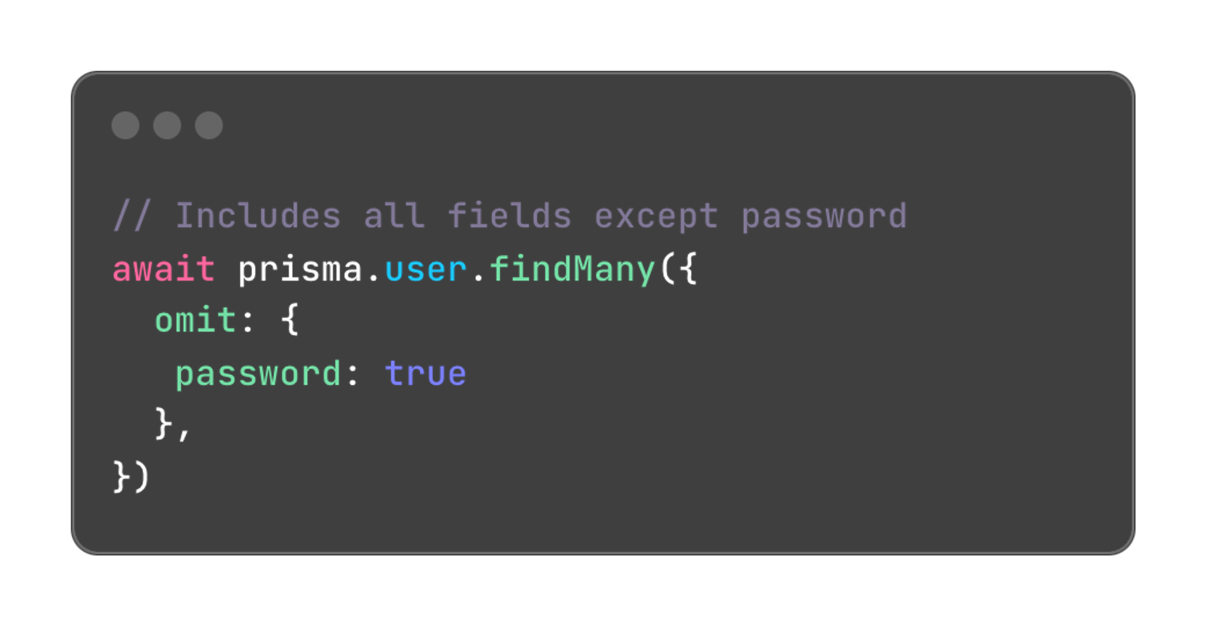omit Prisma Client クエリからのフィールド (プレビュー版)Prisma Client クエリオプション内の omit オプションに対するプレビューサポートを発表できることを嬉しく思います。要望の多かった omit 機能により、データベースから取得したくないフィールドを クエリごとに 除外できるようになりました。